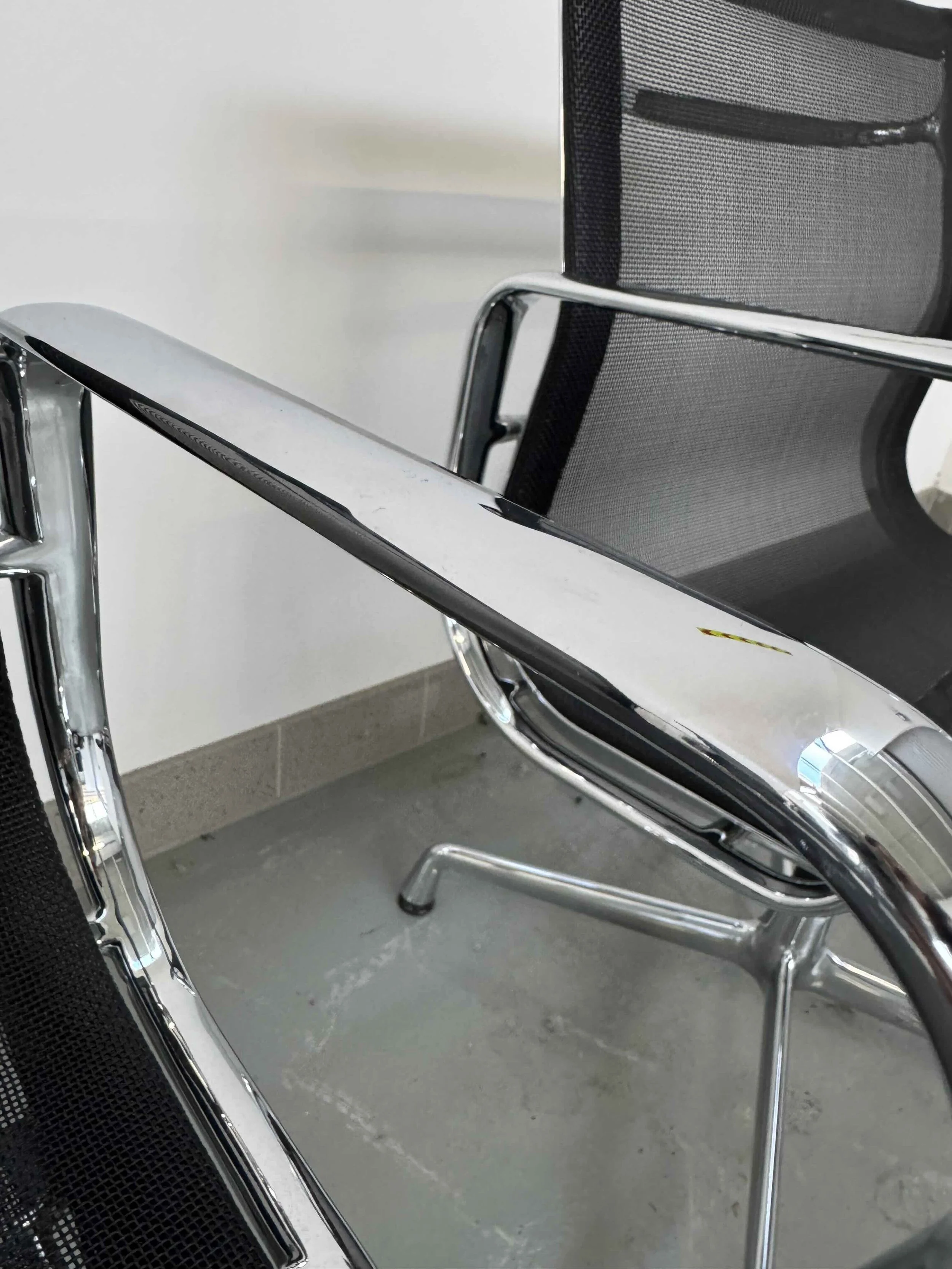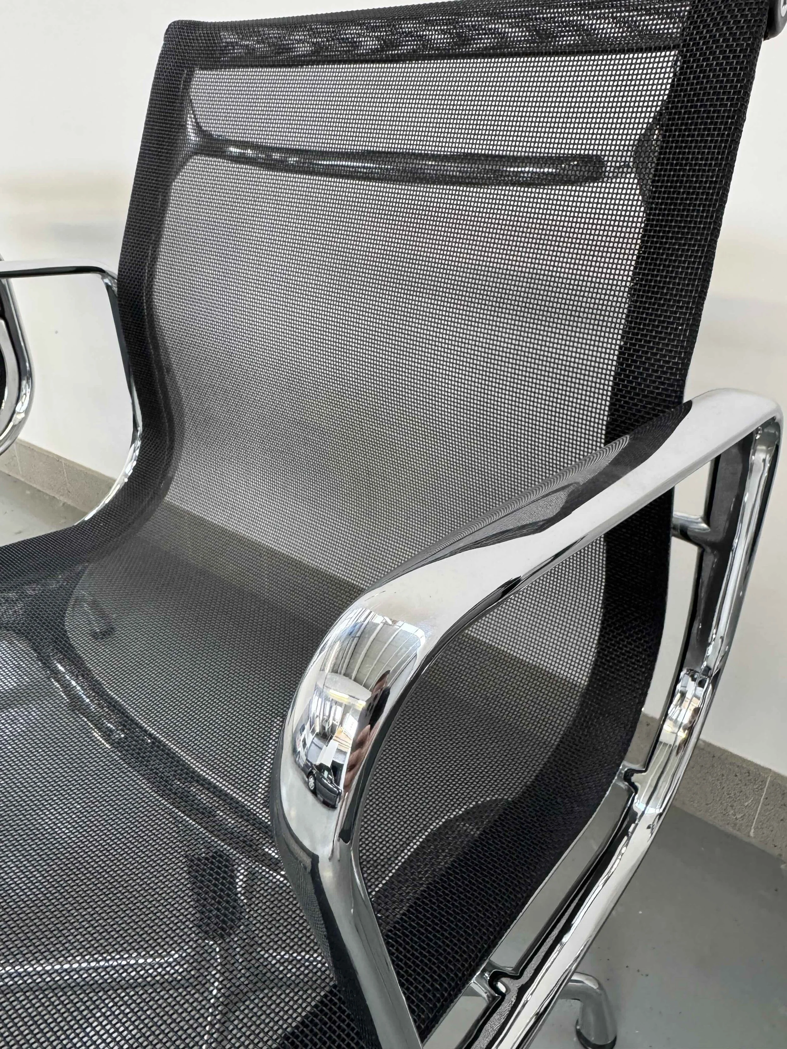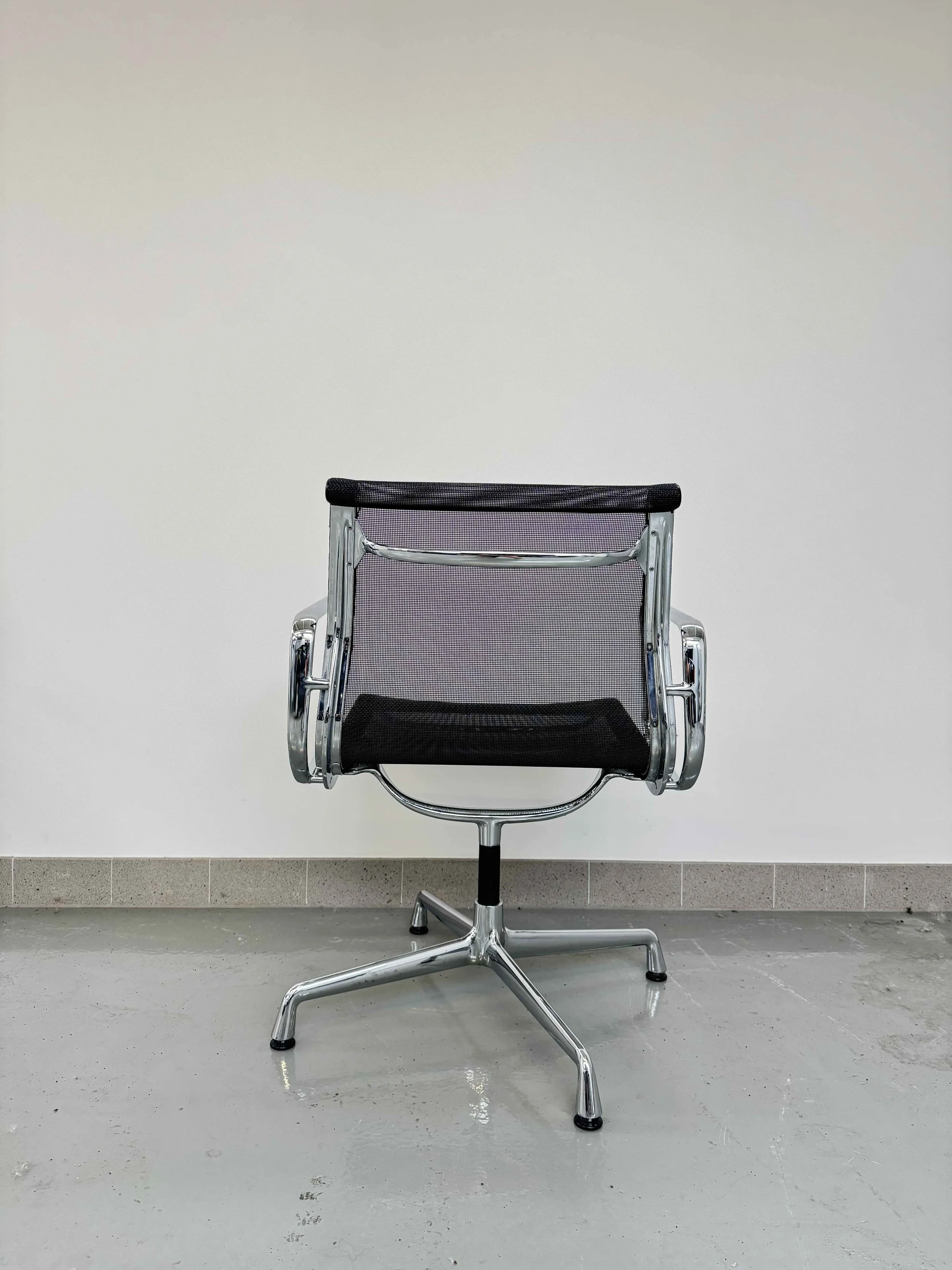 Der EA 108 von Vitra – ein Designklassiker von Charles & Ray Eames – überzeugt hier mit atmungsaktivem Netzgewebe und verchromten Aluminiumprofilen.